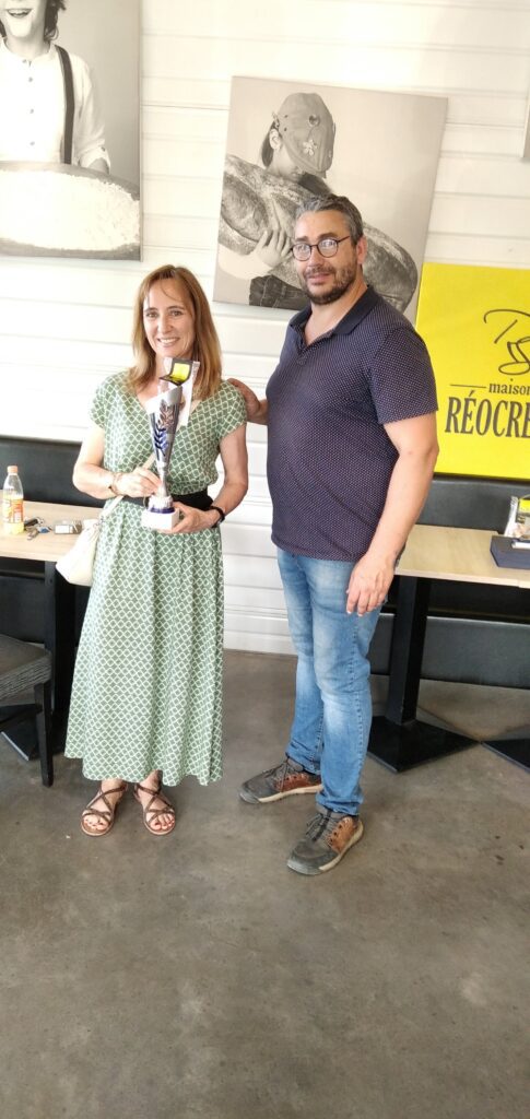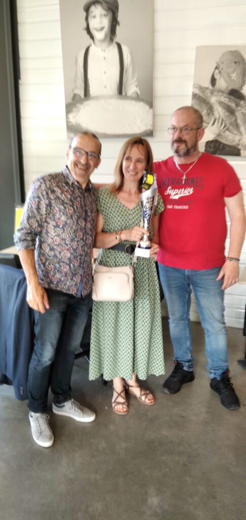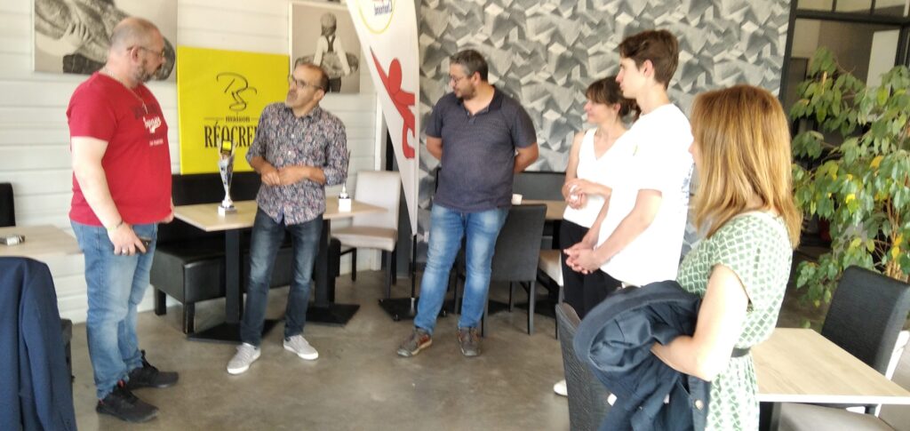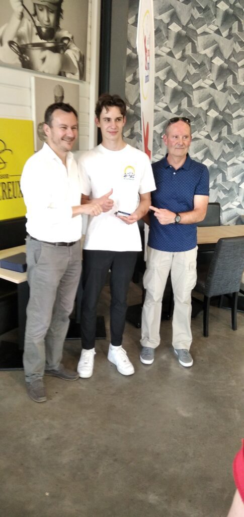 Un mois après l’épreuve, une cérémonie bien sympathique est venue clôturer l’édition 2023 de notre épreuve. C’est dans les locaux de la boulangerie de Sébastien Réocreux que s’est déroulé l’événement, organisé en petit comité. Deux partenaires de notre trail urbain avaient tenu à offrir des récompenses aux valeureux compétiteurs. Il s’agissait de mettre à l’honneur les coureurs locaux les mieux classés, étant entendu que les concurrents classés sur le podium et donc déjà récompensés à ce titre ne concouraient pas pour cette distinction. C’est l’Association Kilian qui ouvrait le ban avec deux coupes offertes à la saint-chamonaise et au saint-chamonais les mieux classés sur les deux courses du 21km et du 10km. La lauréate, Odile Chamaret, se classait en tête des compétitrices de notre cité sur le 10km avec un chrono de 50’41. Olivier Pichon terminait quant à lui 4ème du 21km en 1h28′. Nos deux lauréats recevaient leur coupe des mains du vice-président de l’Association Kilian, Olivier Cressens ainsi qu’un sachet de fameux biscuits préparés par Sébastien Réocreux. Un autre partenaire majeur de notre Office des Sports, France bleu, avait décidé de mettre à l’honneur le jeune coureur le mieux classé : grâce à sa belle 54ème place au scratch sur le 10km dans le temps de 54′, c’est Sacha Merle qui était invité à recevoir le trophée France Bleu Saint-Etienne Loire des mains de son directeur Hervé Chabbal.